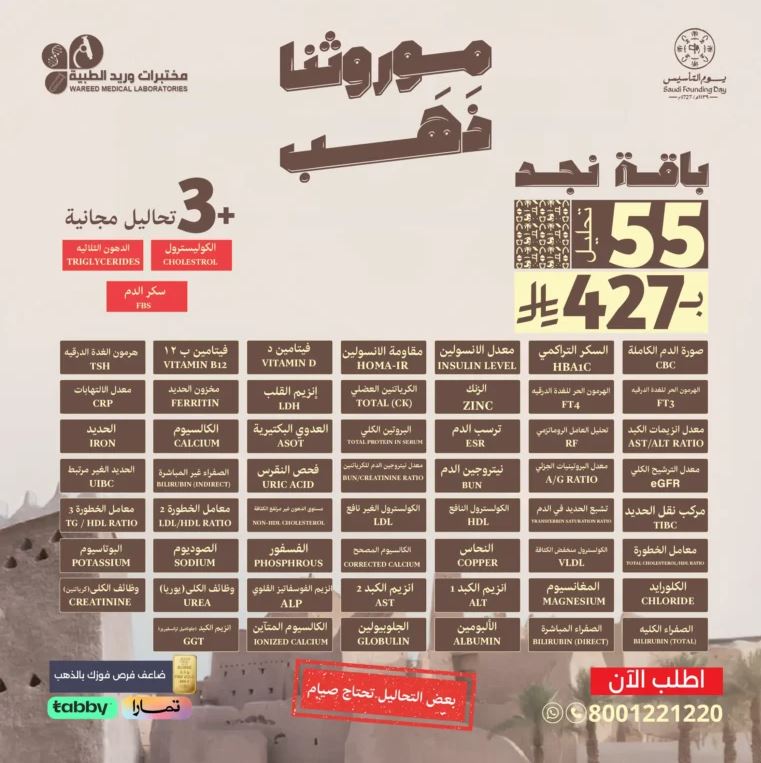 و واحدة من أقوي عروض مختبرات وريد يوم التأسيس 2026 هي باقة نجد حيث أنها باقة شاملة عبارة عن 55 تحليل + 3 تحاليل مجانية بسعر 427 ريال سعودي.